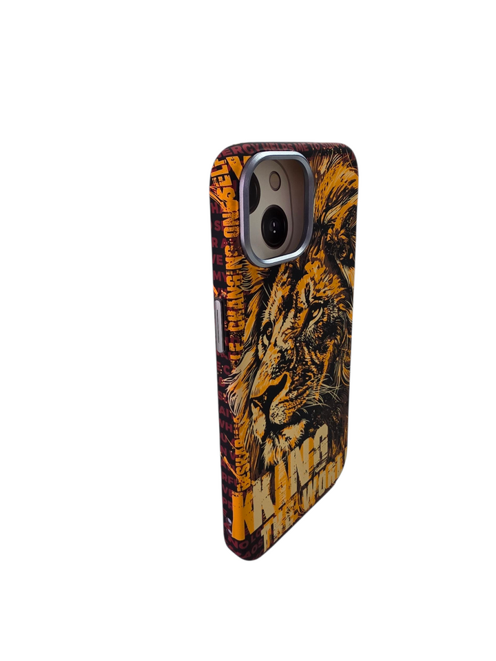 This iPhone 15 PLUS carbon fiber case features a bold and stylish lion-themed design that symbolizes power and confidence. The back showcases a detailed illustration of a lion’s face in shades of orange, gold, and black, with the text “KING OF THE WORLD” printed across the lower part, giving it a fierce and royal look.